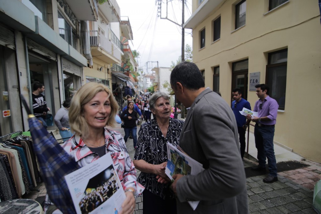 Στη συνέχεια περπάτησε κατά μήκος του πεζόδρομου στο κέντρο της Παραμυθιάς. Κοντά του βρισκόντουσαν εθελοντές του Ποταμιού από την περιοχή, οι οποίοι μαζί με τον επικεφαλής μοίραζαν το φυλλάδιο του Κινήματος με τις θέσεις για την Ήπειρο.