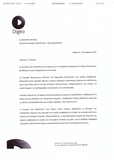 Την εγκατάσταση ηλεκτρογεννήτριας στο κέντρο εκπομπής «Φαρμακοβούνι» για την αντιμετώπιση της διακοπής του ψηφιακού τηλεοπτικού σήματος και μέχρι την αποκατάσταση της βλάβης στο δίκτυο της ΔΕΗ έχει σχεδιάσει η DIGEA, όπως αναφέρεται σε επιστολή του Γενικού Διευθυντή της DIGEA προς τον Β. Γιόγιακα. Η απάντηση ήλθε σε συνέχεια της επιστολής του βουλευτή Θεσπρωτίας προς την DIGEA με την οποία η εταιρεία καλείται να προβεί στις κατάλληλες ενέργειες για την οριστική αποκατάσταση των προβλημάτων εκπομπής ψηφιακού σήματος σε διάφορες περιοχές της Θεσπρωτίας.