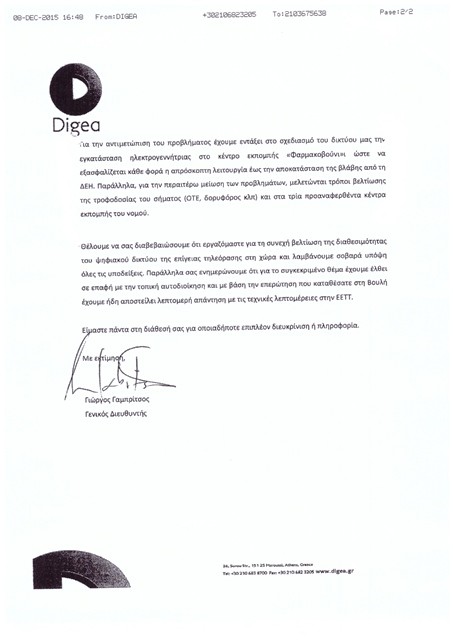 Επισυνάπτεται η απαντητική επιστολή της DIGEA