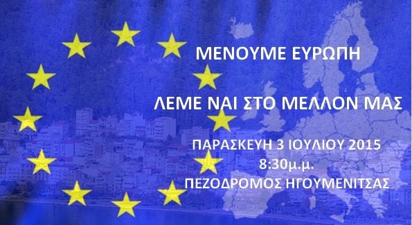 Έχουμε ήδη αρχίσει να μετράμε αντίστροφα για το δημοψήφισμα της 5ης Ιουλίου και η πρωτοβουλία «Μένουμε Ευρώπη» καλεί σήμερα σε νέα συγκέντρωση στον πεζόδρομο της Ηγουμενίτσας υπέρ της παραμονής μας στην Ευρωπαϊκή Ένωση και την Ευρωζώνη.