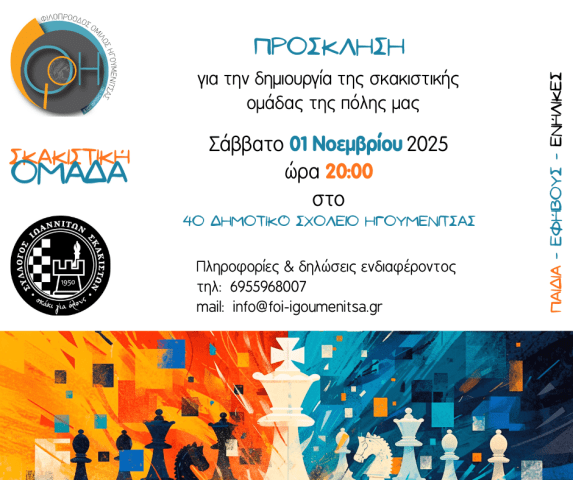 Ιωαννιτών Σκακιστών, είστε ευπρόσδεκτοι στην πρώτη μας συνάντηση το Σάββατο 01 Νοεμβρίου στις 20:00 στην αίθουσα εκδηλώσεων του 4ου Δημοτικού σχολείου Ηγουμενίτσας.